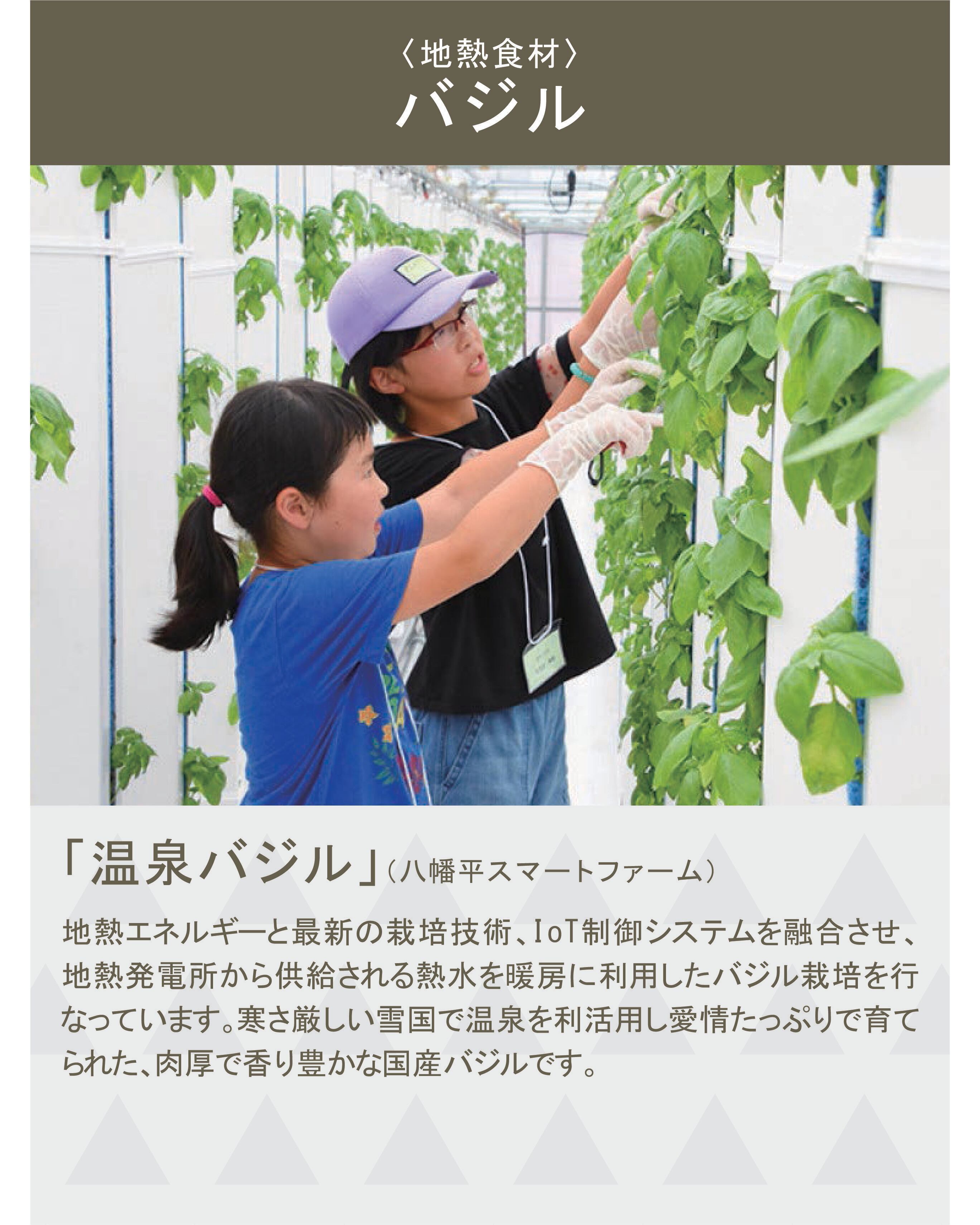 みんなに優しい「八幡平スマートファーム産 温泉バジル」を栽培しています。